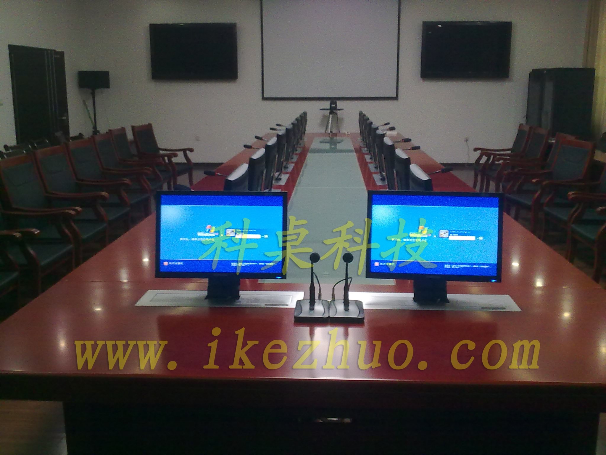 需要使用顯示屏?xí)r,隱藏在會(huì)議桌內(nèi)部的升降機(jī)把顯示屏從會(huì)議下面升到桌子表面;當(dāng)不使用顯示屏?xí)r,升降機(jī)自動(dòng)下降,顯示屏隱藏在會(huì)議桌內(nèi)部,防盜、防塵;保持桌子表面的平整和美觀。